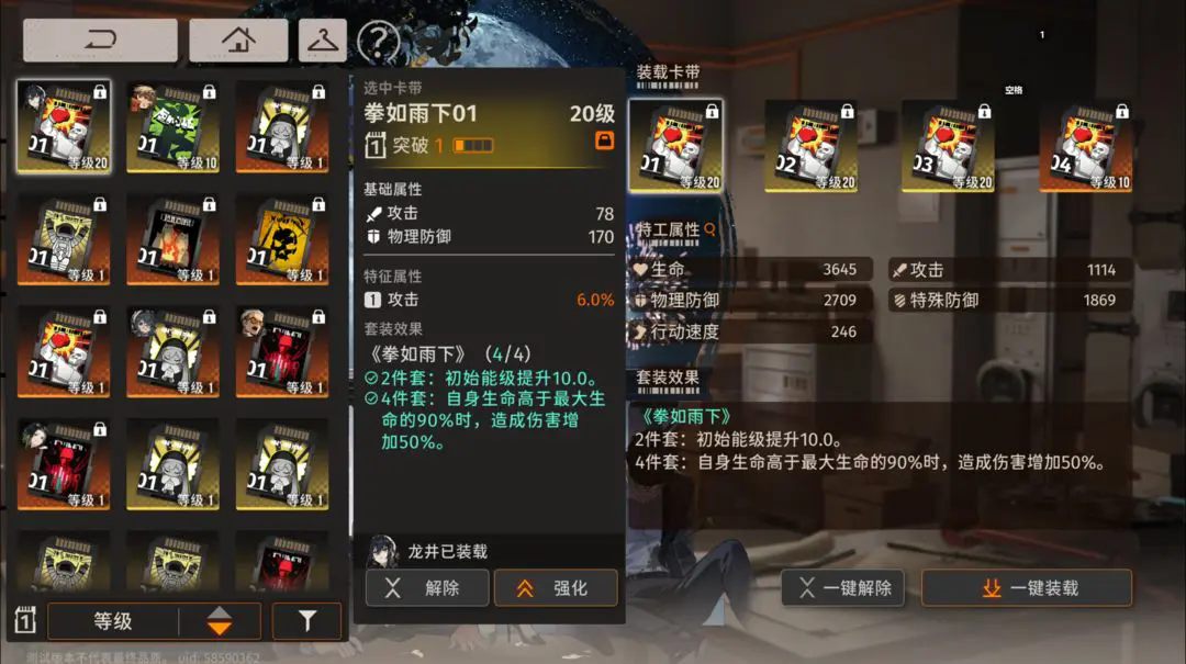龙井作为开服第一个up池角色,强度于立绘并存,本身技能手段就是降物防和无视部分防御输出,降防效果比较万金油,多场合通用,对单伤害很高,一门提供溅射伤害可以补对群,不过不算特别重要,卡带选择恶灵公馆提高攻击和伤害