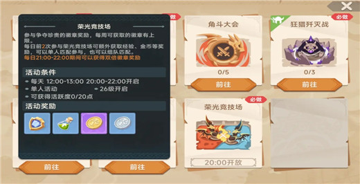 1. 荣光竞技场:跨服PVP玩法,每日12-13点、20-22点开启,每日21:00-22:00期间可获得双倍徽章奖励,建议在该时间段参加活动,徽章可用于兑换道具;
