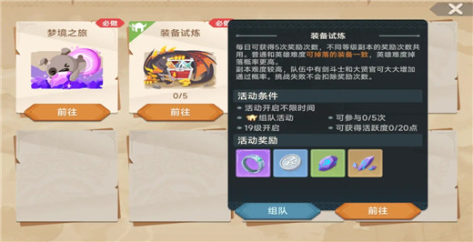 2. 装备试炼:分为普通难度和英雄难度,每日5次,建议只打英雄难度,会有更高概率掉落高品质装备,从40级试炼开始,将会掉落磨牙之龙道具以兑换传说级装备;