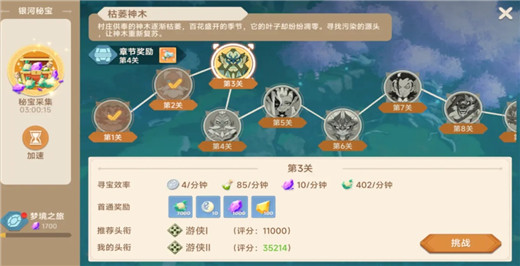 2. 银河秘宝:是获取晨星碎屑(用于梦境之旅派遣)的途径,也可以获取经验等奖励,层数越高,挂机获取的奖励也越高,建议打到卡关为止;
