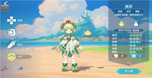 4、神官:远程法术辅助职业。以圆铃为武器,可以为队友提供治疗。上手难度:4颗星。