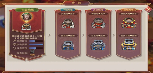 游戏内有箭塔、策士塔、步兵塔、炮塔四种类型,这些防御塔可以升级,中级、高级、顶级分别在武将等级:10级、30级、45级时可以开启晋级,升级后,攻击伤害和攻击范围也会随之上涨。1、箭塔