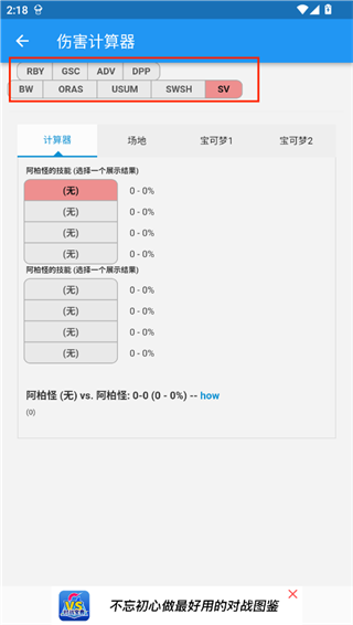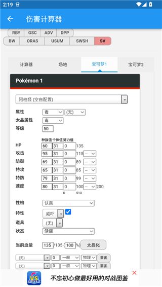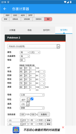 2、进入计算器之后,可以在上方切换要计算的宝可梦类型,在下方输入宝可梦的该技能