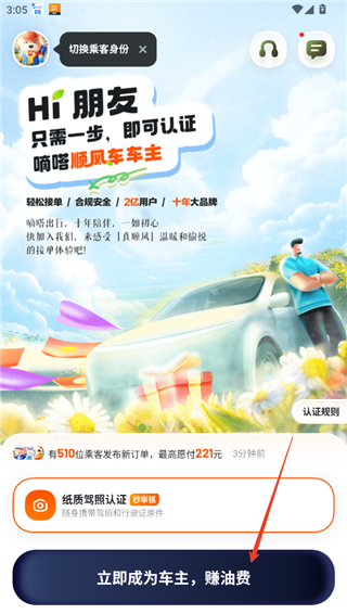 2、进入软件之后点击下方的“立即成为车主,赚油费”