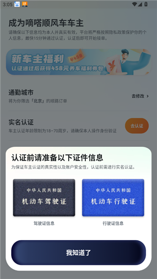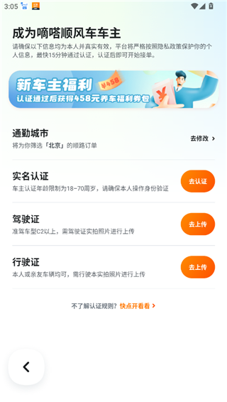 3、根据提示准备好相关的证件,然后填写通勤城市,实名认证,驾驶证和行驶证,完成之后等待平台验证即可