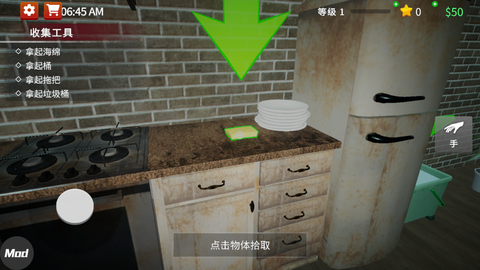 2、滑动屏幕控制方向,虚拟轮盘控制角色行走,点击物品即可拾取。
