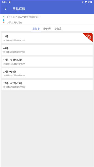大同公交app提供了一个智能的出行导航服务,输入你的起始地点和目的地点,软件会智能为你规划出多条不同的公交线路,其中有最短行程、最短时间、最少换乘等,你可以根据自己的需求进行选择。不仅如此,软件还提供热门资讯服务,你可以看到最新最实时最权威的公交车线路规划挑战,再也不用因为消息滞后耽误出行而烦恼了。有需要的朋友快来本站下载软件吧。