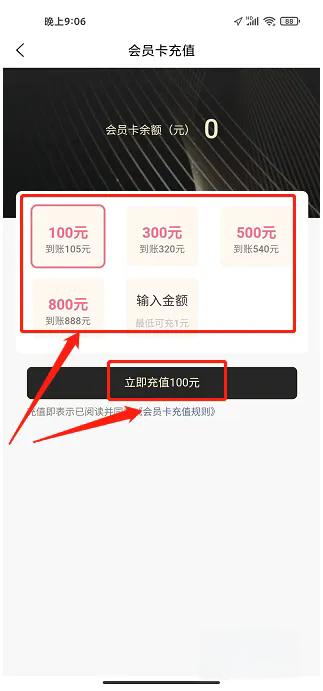4、接下来,你会看到一个会员卡充值的页面,选一个你想充的钱数,然后点击立即充值就好啦。