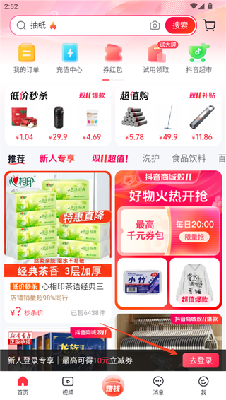 抖音商城app是一款非常受欢迎的电商购物软件,适逢双十一期间,这里为用户带来了大量的折扣福利,众多商品都进行了折扣减免,还有着各种各样的优惠券发放,让用户可以以一个极其优惠的价格购买到想要的产品。这里的产品几乎涵盖了生活的方方面面,如洗护,食品饮料,百货,运动,配饰等,用户可以根据自己的需求前往对应的分类中寻找产品,同时,用户还可以在这里进行话费充值,在这里充话费可以获得一定的优惠减免,如果使用抖音月付功能,还可以进一步获得优惠。