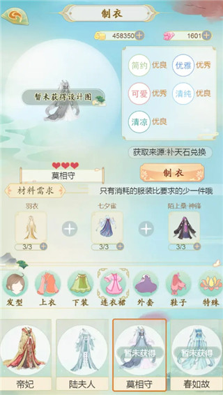 制衣消耗的原材料均为相对低级的服装,当所需的材料满足时,点击制作,制作出新的服装时,材料服装还会保留一件的。对于定制服装我们也需要材料齐全,如果材料缺失可以通过钻石、金币进行购买,还有些材料是需要完成任务才能获得。