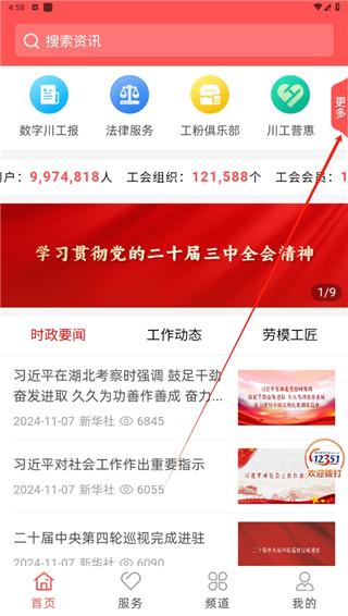 1、提供线上职工入会服务,法律援助,咨询服务。能保障职工的就业权益和工资收益的软件。2、职工可以学习更多的文化,提供健康咨询、体检服务,能关爱农民工。