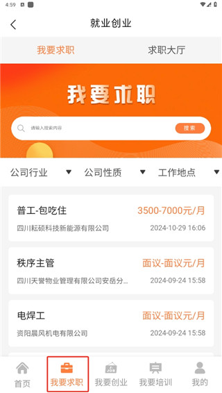 除此之外,川工之家app还提供了求职找工作服务,在我要求职功能中有着丰富的岗位资源,其中分为工厂普工、财务主管、电焊工等,点击进去就可以查看详细的工作情况。而且还提供了筛选功能,你可以通过薪资、公司地点、工作内容等条件筛选,寻找自己满意的工作。有需要的朋友快来本站下载软件使用吧。