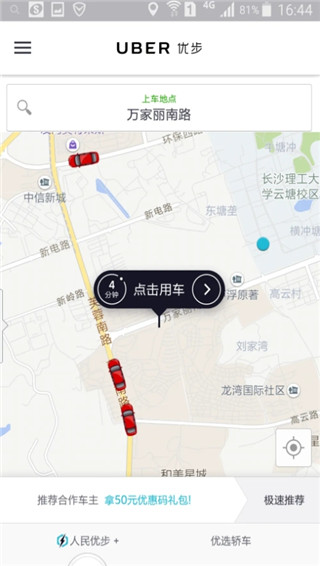 4、软件支持多种车型,寻找完地址后点击【点击用车】呼叫司机