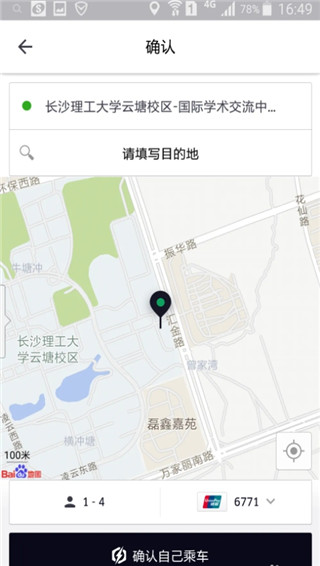 2、输入到地址后选择拼车或自己乘车,点击确认
