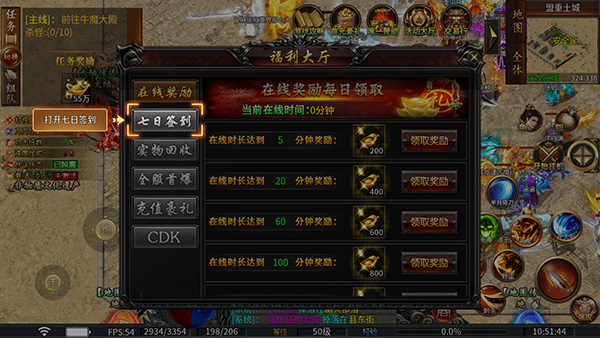 2、然后点击福利大厅里,在这里可以免费领取在线奖励和七日签到奖励;