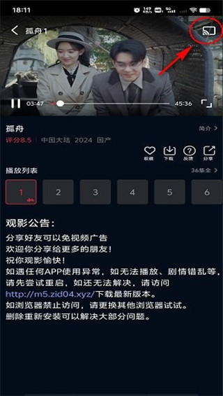 2、进入播放界面后,点击如下图所示的按钮,箭头所指,这个就是投屏功能;