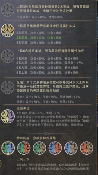 当然,如果能在战场上部署同系的英雄,确实可以获得更高的属性加成,这也正是我们之前提及的各个队伍的独特玩法所在。然而,由于同系英雄的培养成本通常较高,对于新手玩家或资源有限的玩家来说,建议采取散搭策略。