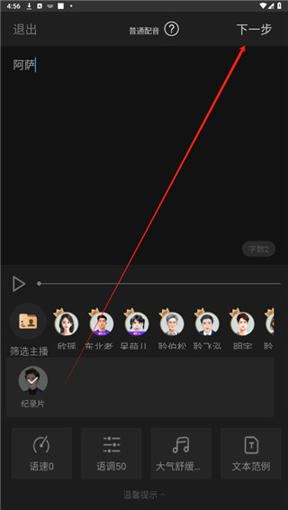 3、输入你要配音的文字点击右上角的下一步。软件中还有自由设置配音的语速等