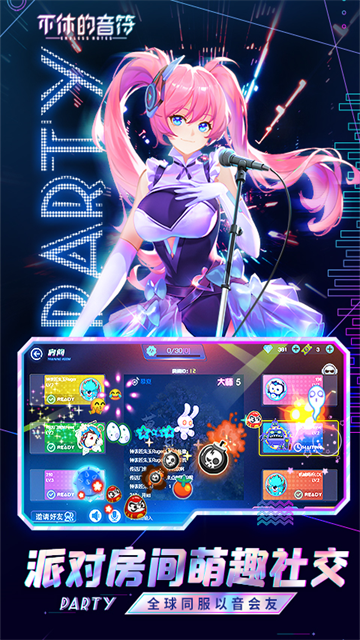 派对房间玩法中,可以自由匹配或者创建房间,还可以邀请微信/QQ好友进入房间实时PK,每个房间最多可容纳6人,在房间中选择一个曲目,实时打歌PK,6人竞技,一人吃鸡!