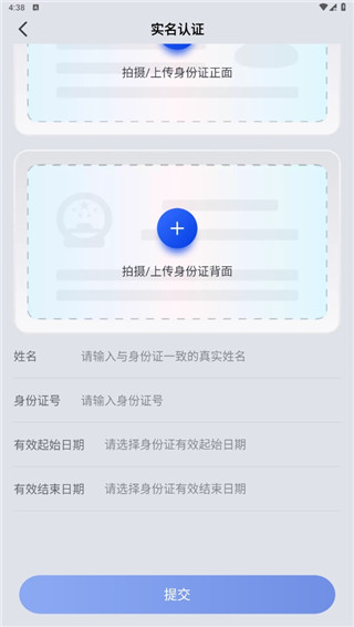 3、上传证件照后再输入,姓名、身份证号、身份证时间后,点击提交即可