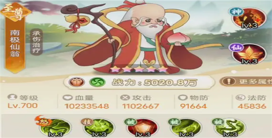 福寿赐福:对敌方单体目标造成攻击力180%的法术伤害,并附带南极仙翁最大血量10%的法术伤害,然后再治疗南极仙翁自身10%已损血量。