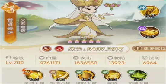 功德无量:己方单位释放小技能时,普贤菩萨获取一层【佛光】。普贤菩萨释放怒气技时可以消耗自身3层【佛光】额外提升己方后排单位10%暴击,持续1回合