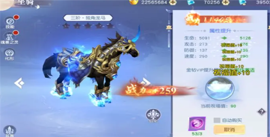 通过界面的坐骑按钮,点击一下就能打开坐骑界面了,在界面中可以看到各种属性加成数值。培养坐骑进阶可以提升这些属性数值,以及解锁更多技能或更拉风的外形。