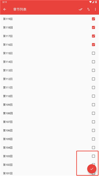 2、选择你需要下载的章节,点击右下角的红色图标