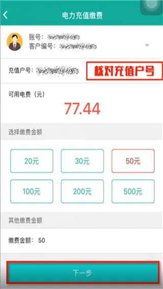 2、在缴费的假面中,输入充值户号后选择需要缴费的金额