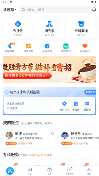 2、首页可以看到许多实用功能,不仅可以在线挂号,还能随时问诊哦