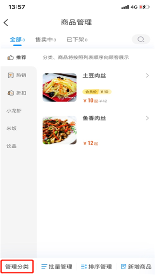 1、首先我们需要进入商品分类板块,点击左下角的管理分类