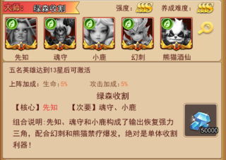 1、绿森收割阵容组成:先知+魂守+小鹿+幻刺+熊猫酒仙;