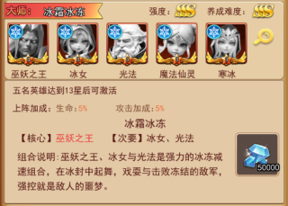 1、英雄是玩家进行游戏战斗的主要战力,玩家需要通过招募、活动等各种手段来获取到丰富的英雄;2、英雄分为:冰、森、炎、神、魔,共计5个阵营,各阵营之间存在着相对应的克制关系;