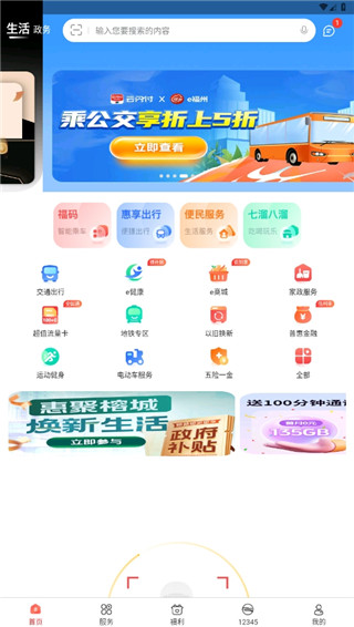 1、在首页中可以看到生活动常用的功能,如交通出行、家政服务、以旧换新等