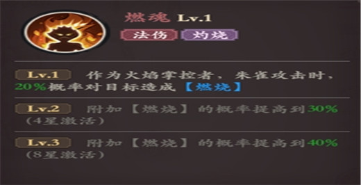 朱雀在普攻时,有概率附加燃烧效果,这是它持续输出的关键。它通过普攻给敌人叠加燃烧层数,从而增加自身大招的伤害。同时,燃烧效果带来的【裂肤】还能提升全队的法术伤害。