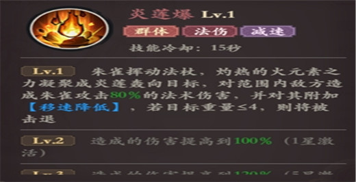 朱雀主动挥动法杖对范围敌人照成自身攻击力的法术伤害,并对其附加【移动速度降低】的效果,并且目标重量≤4的时候,会照成击退。这个技能是关键是给对方上减益效果和照成击退,可以很好的让敌方难靠近朱雀,从而保证朱雀的生存几率。