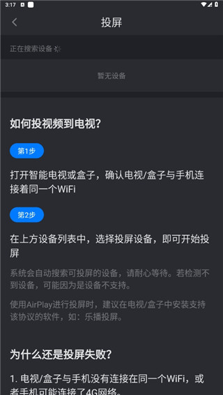 4、使用投屏功能可以将影视投屏到电视机中,软件还提供了详细的投屏教程