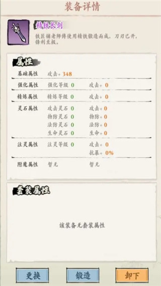 装备强化可以提升装备的基础属性,装备强化需要大量银元,装备强化的属性高低取决于装备的品质,装备品质越好强化获得的属性越多。装备的强化等级上限与主角境界相关。