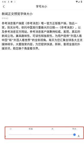 而且这款参考消息app还提供了听新闻功能,在我们上班时、坐车时通过听新闻功能不看手机屏幕也可以了解新闻大事了,非常的方便。此外,软件还贴心的考虑到了老年人用户群体的使用,于是推出了字体调节功能,你可以自由调节字体的大小,老年人用户也可以使用软件清晰的了解到新闻了。喜欢阅读新闻的朋友快来下载软件了解吧。