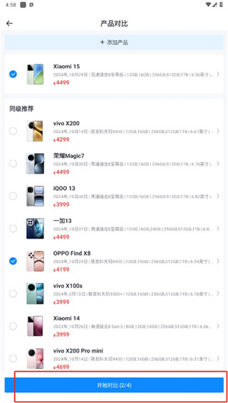 3、系统会为你罗列处同级的相关产品,选择你要对比的另一个产品