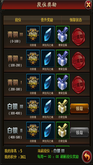 玩家天梯积分达到指定要求后可领取相应的段位奖励,并且会按积分高低进行排名,排名前5的玩家可获得专属的称号奖励。每周一0点会重置积分和段位奖励。