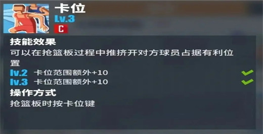 卡位:可以在抢篮板过程中推挤开对方球员占据有利位lv.2 卡位范围额外+10lv.3 卡位范围额外+10C基础技能之一。卡位细节需要多加练习,寻找一个好的卡位位置很重要!
