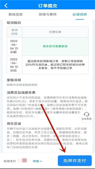 3、最后选择好保险套餐,下滑到最下面点击免押并支付即可