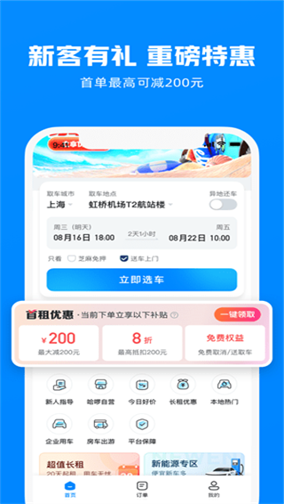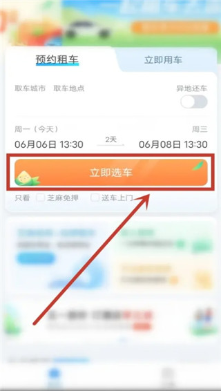1、打开哈啰租车app,输入取车城市和地点,点击立即选车