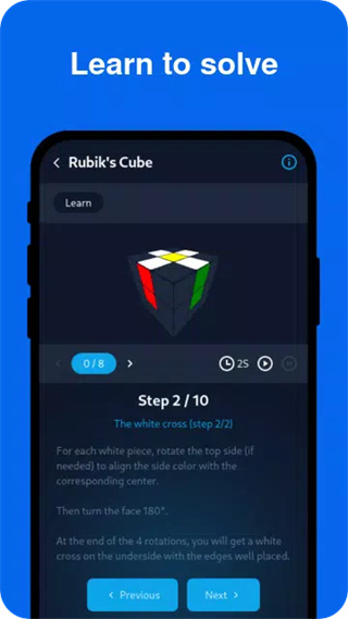 1、有着各种各样的魔方还原教程,保证让你一下子就学会2、有着高清的还原画面,每一步还原步骤都可以一目了然