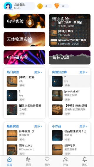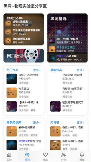 在物理实验室app中不单单可以进行电学实验,还提供了天体物理实验、电与磁实验等,用户可以根据自身的需求自由进行,而且软件内还提供了黑洞板块,这里面不仅有着各种热门的作品,还有海量的知识库等你来学习,当你遇到不懂的问题时,还能通过发布帖子的方式进行求助哦。
