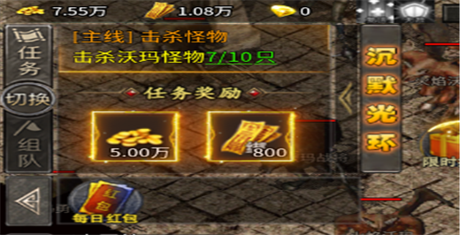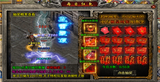 每日任务。每日红包、BOSS悬赏、白嫖赞助、在线充值、升级奖励、转生奖励,记得一定要及时领取,所有货币和累充都可以爆出,所有小怪都可爆出充值红包,每下一个大陆爆率都会增加所有BOSS必爆充值红包。