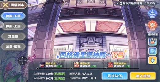 周常副本分为西格佛里德神殿·下层和西格佛里德神殿·上层,每一层对应三个BOSS。西格佛里德神殿·下层BOSS:黑月公主、蜂怪女王、野蛮族巫女。下层较为简单无需组队均可通关,通关BOSS后可翻牌有机会获得西格佛里德套装(特殊装备)、西格佛里德古代石板以及西格佛里德之魂。