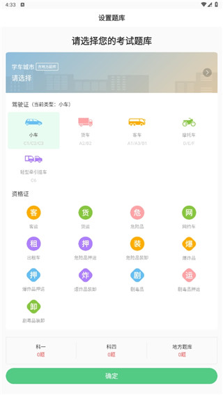 1、进入到软件中,你需要选择你所考的驾驶证类型和城市,点击下方的确定