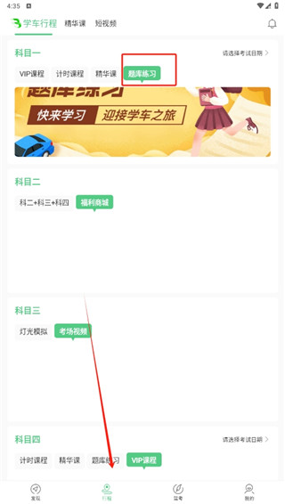 2、在行程板块中点击题库练习板块,选择你需要的图库练习
